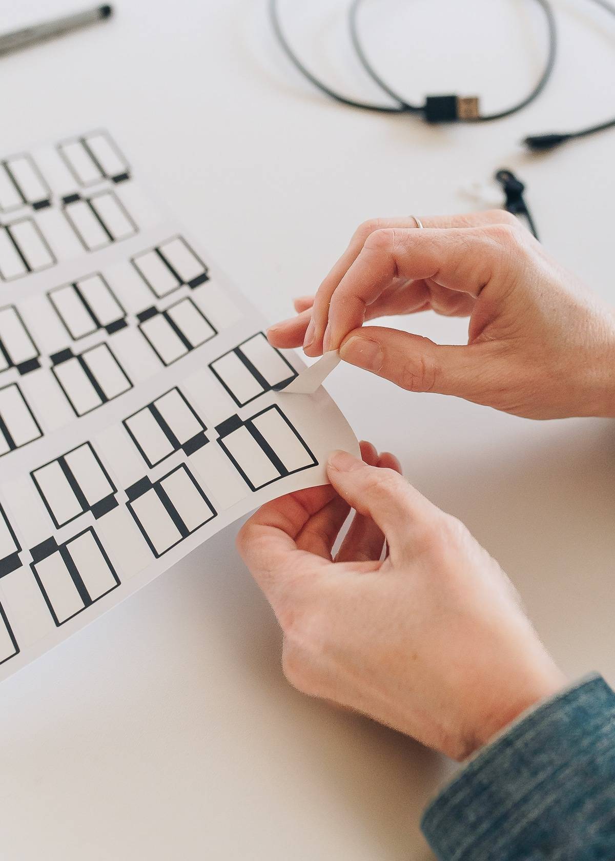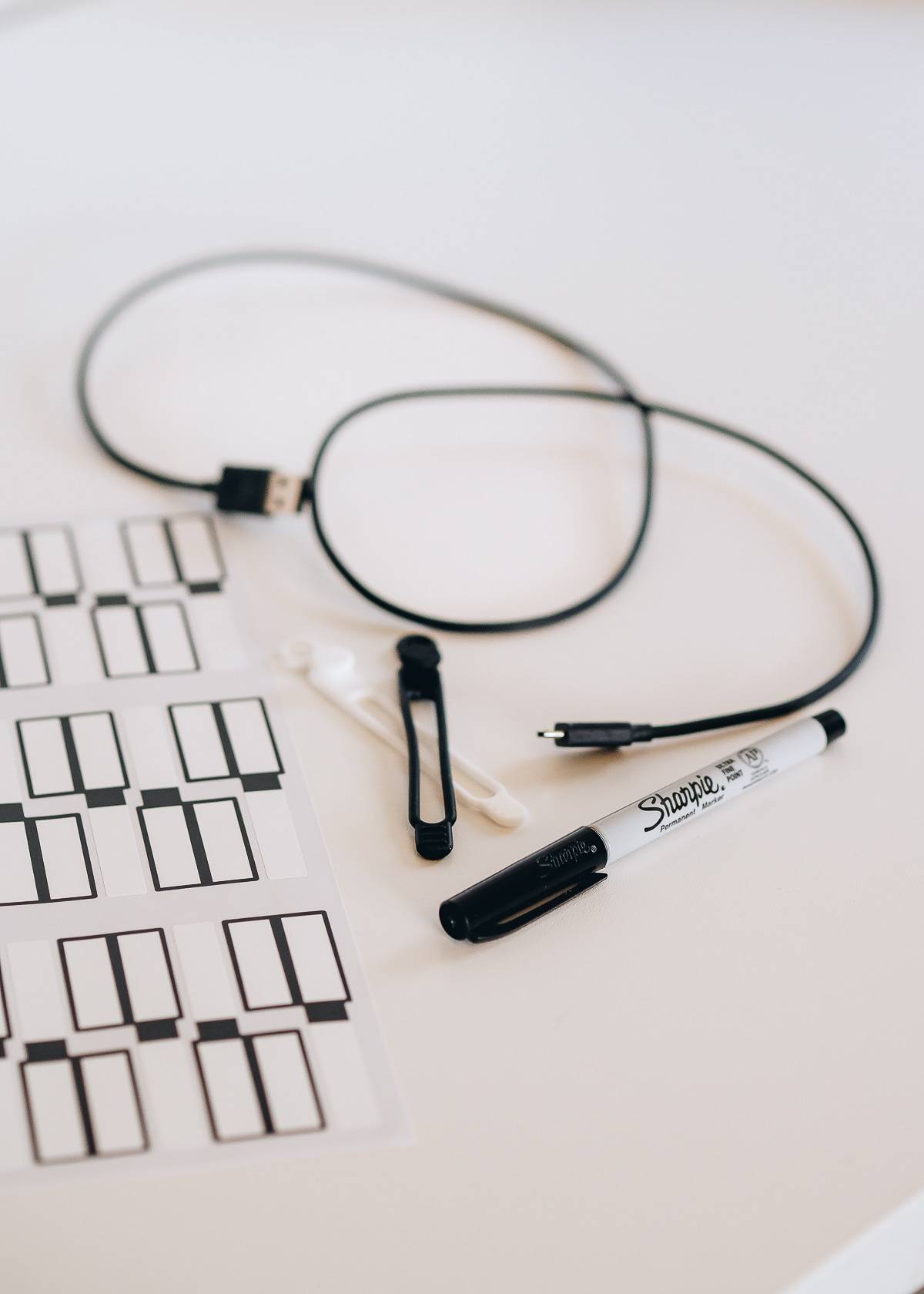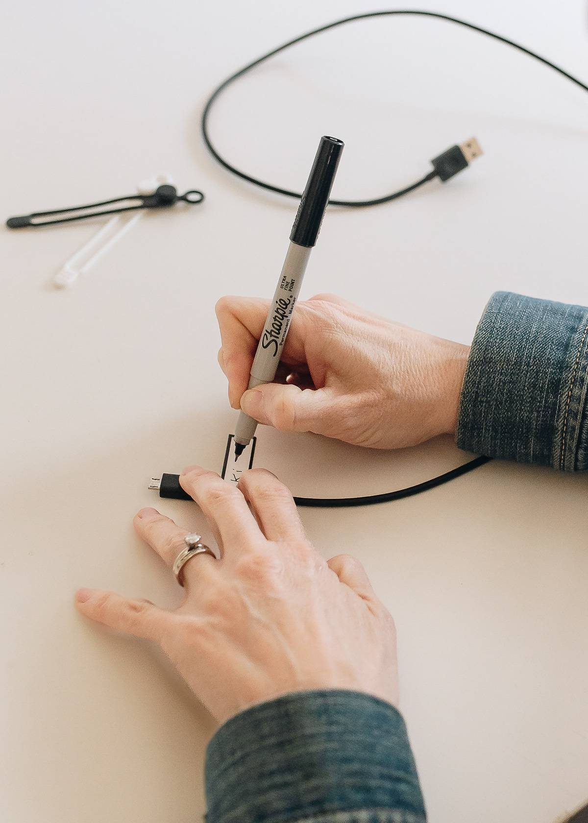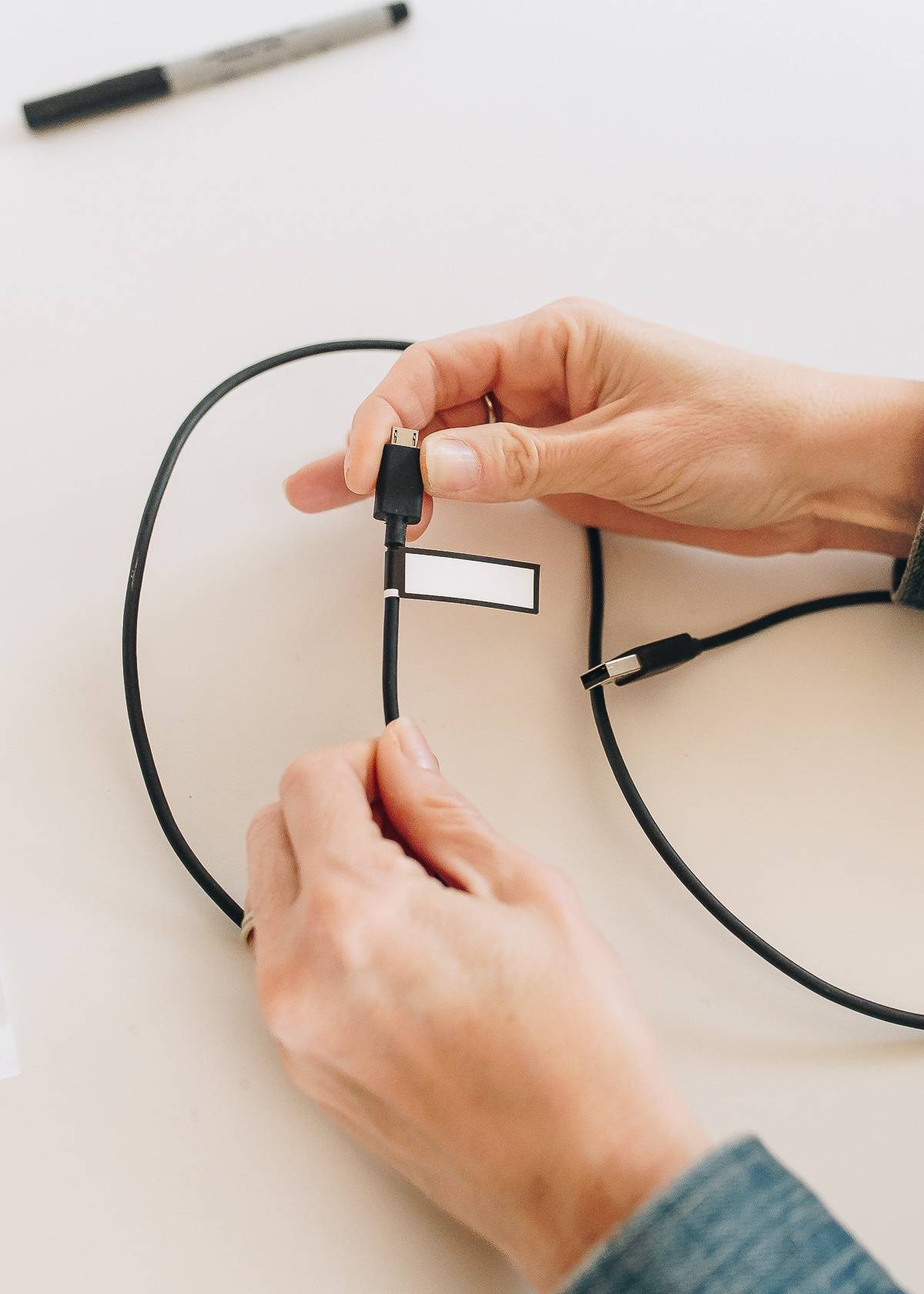 - They are so easy to apply to cords. After wrapping the label around the cord, fold the label portion in half (along a perforated line!) and add a quick label (I found an Ultra-Fine Sharpie works best for smudge-free results!)