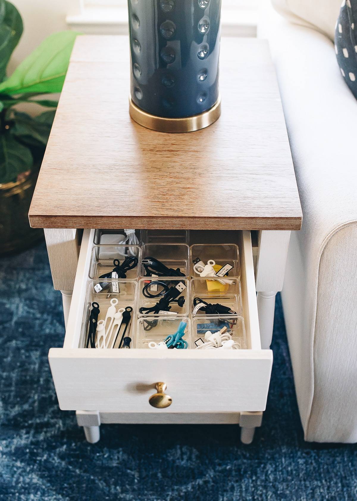 Instead of keeping all the cords in the office or kitchen, it occurred to me that we could store (our most used) cords in this side table drawer (I just used a bunch of these 3x3” drawer dividers to keep them separate).