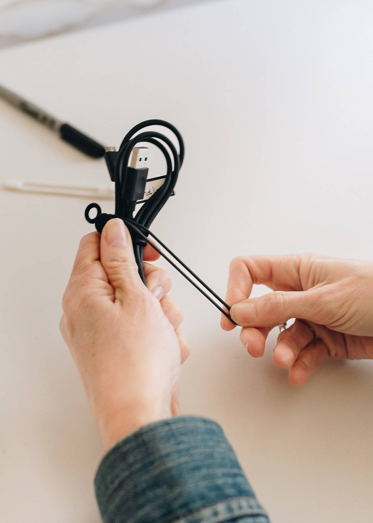 For a long time, I’ve used magnetic cord ties to corral untidy cords. But depending on how long/thick your cords are, sometimes the magnets aren’t strong enough to hold the bundle together.